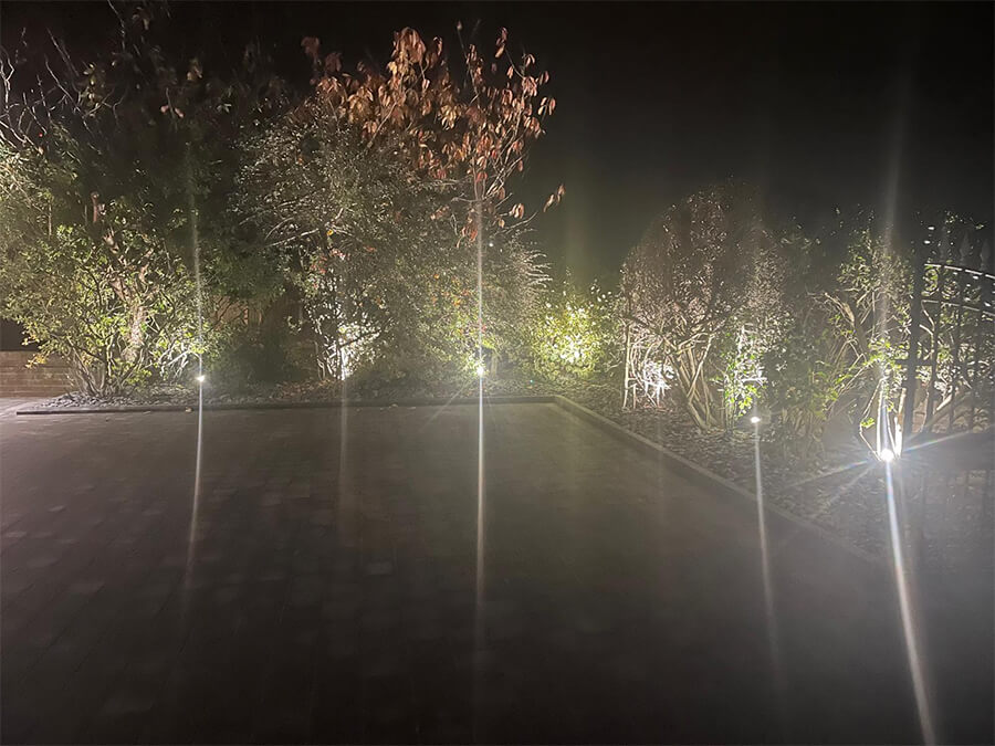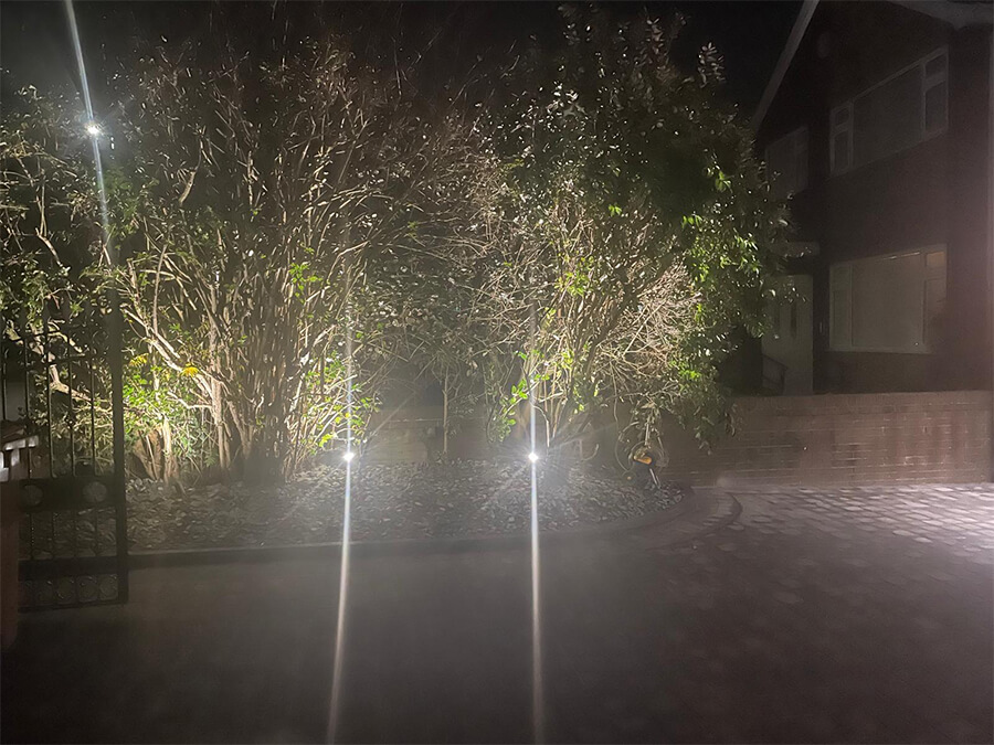 Positioned and installed 10 spike spotlights along the driveway borders to accent the planting and create a defined approach. Each fitting angled to reduce glare and softly uplight the foliage for warmth and depth.